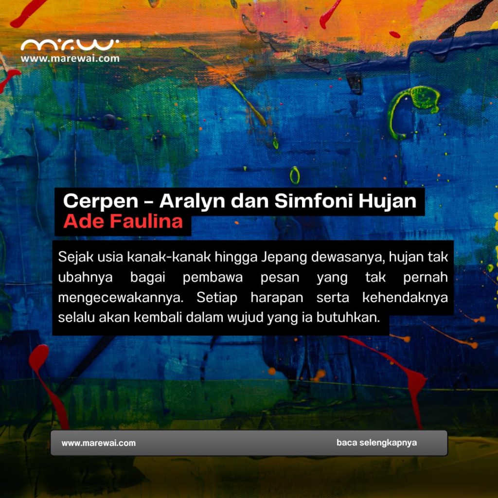 Aralyn cepat-cepat menghapus tetes air mata yang meleleh di kedua pipinya. Kini ada hangat yang mengalir di dadanya. Bersambut dengan rasa rindu di tubuhnya. Rindu untuk mengunjungi kampung halaman, berjumpa dan bercengkrama dengan adik dan keluarganya yang tersisa. Serta keinginan untuk kembali mendengarkan simfoni hujan, sambil berharap sesudahnya sinar matahari yang hangat menyentuh kulitnya. Aralyn pun sudah tidak sabar agar esok segera menyapanya. (Padang, 6/5/2024).