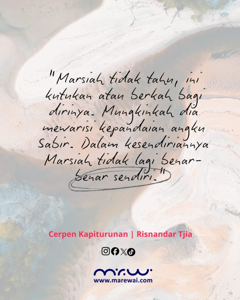 Dia terjungkang, pandangannya gelap, dunianya terasa menjauh dan semakin jauh. Dalam sisa-sisa kesadarannya terdengar langkah-langkah samar kemudian hilang. Entah berapa lama, saat sadar Marsiah menemukan dirinya di atas palanta panjang di dapur. Dia duduk dan berusaha mengingat apa yang telah terjadi padanya. Dia bingung.
