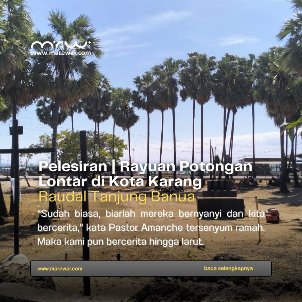 Tempat paling rapat ditumbuhi pohon lontar adalah Pantai Oesapa. Saya ke sana bersama seorang kawan, Ragil Sukriwul, tahun lalu, berkendara motor dari Oebobo dekat pusat kota. Matahari sedang lurus di atas kepala. Kupang yang berjuluk Kota Karang memang terkenal panas, namun malam hari cuacanya berubah sejuk dan nyaman. Ibarat tanahnya yang tandus, tapi begitu hujan turun sedikit saja, semua cepat berubah hijau. Begitulah alam mengatur siklusnya.
