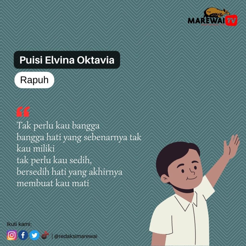 Penulis, Elvina Oktavia, Lahir di Kota Sawahlunto sejak awal januari 2022 menjadi pendidik di SMP Perguruan Islam Ar risalah. Sempat menyelesaikan pendidikan di salah satu Universitas di Kota Padang pada Jurusan Bimbingan dan Konseling. Aku senang melakukan hal yang baru, buktinya mulai mempelajari kegiatan menulis puisi ini. Ini puisi yang kesekian kalinya ku coba buat setelah jatuh bangun untuk menyelesaikannya. Salut untuk semua penulis, ternyata menulis itu tidaklah mudah, tapi akan mudah jika kau mulai menyenanginya. Terima kasih untuk semua mentor ghaib yang bisa disebutkan satu persatu.